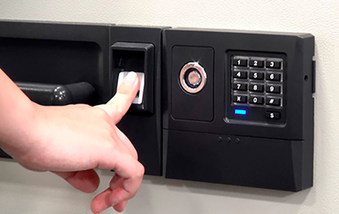指紋照合式(10指登録可能)、テンキー式(暗証番号10種類登録可能)、ICタグ式(10種類までの接触型ICキーを登録可能)をワンボディに収めたマルチロックシステムです。各ユーザーに合ったロックシステムを1つ選んで使用できます(解錠履歴を記憶します)。